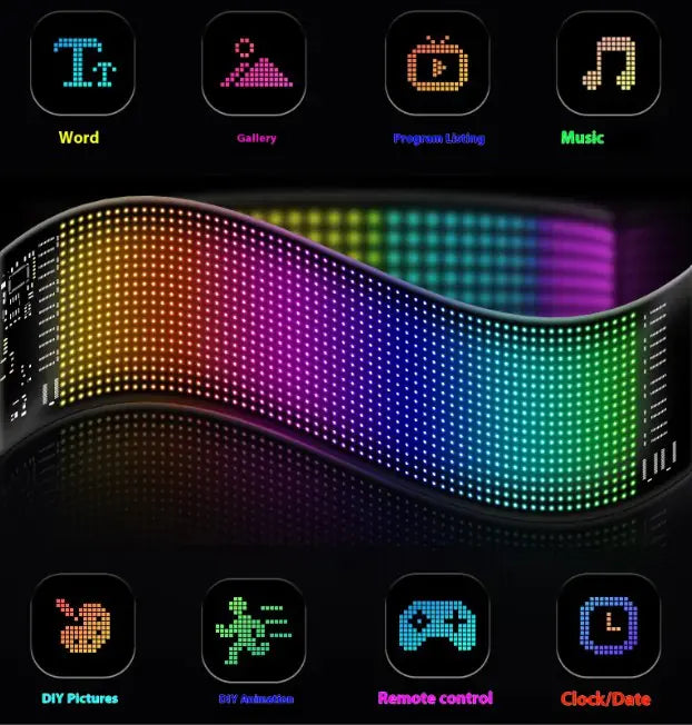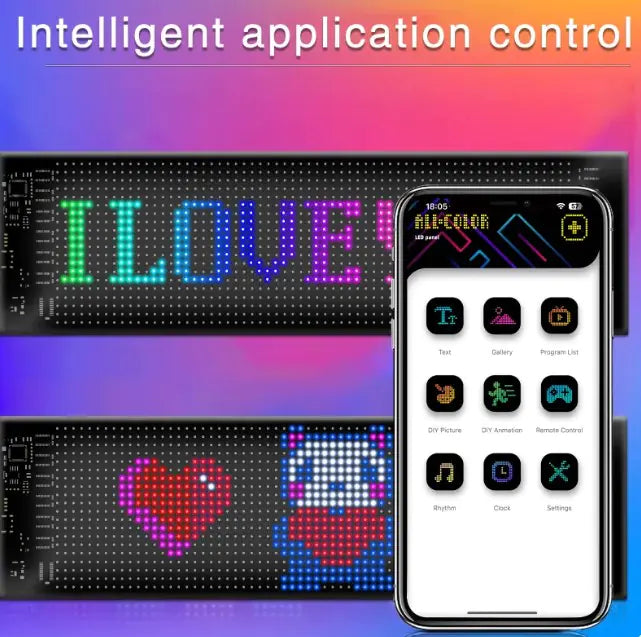 - App-Controlled: Fully customizable through an easy-to-use mobile app (available for both iOS and Android), enabling users to control scrolling text, animations, and images from their smartphone.